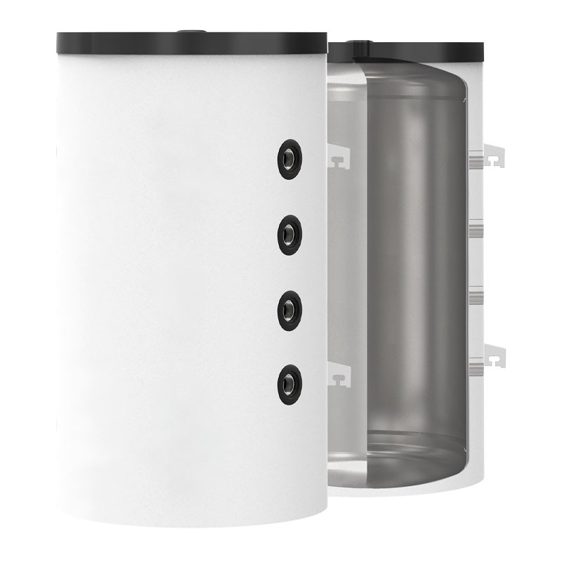 Il modello PS ZN 100 è privo di serpentino interno, il che lo rende estremamente versatile e adatto per diverse configurazioni impiantistiche. Può essere integrato facilmente in sistemi ibridi o tradizionali come accumulo tampone, servendo da serbatoio di compensazione tra la generazione del calore e la distribuzione. Gli attacchi idraulici (in numero variabile a seconda del modello) permettono una connessione semplice ai vari circuiti, mentre lo scarico e lo sfiato completano l'equipaggiamento tecnico del puffer.