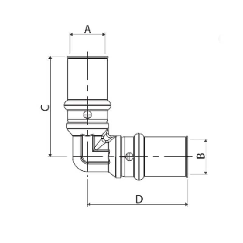 Raccordo a pressare a gomito 90 gradi per tubo multistrato. Gli articoli sono dotati di doppio o-ring di tenuta, più anello in PE per eliminare eventuali correnti vaganti. I raccordi vengono utilizzati in impianti di adduzione gas.