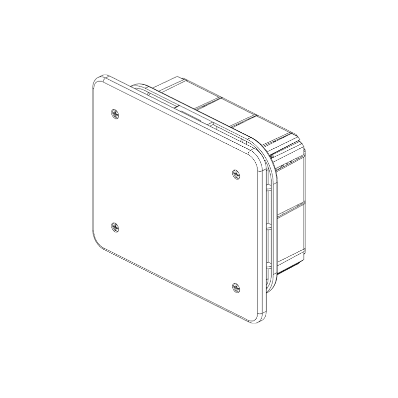 Scatola di derivazione Vimar da incasso (GW 650 °C) con coperchio bianco e viti di fissaggio. Dimensioni 116x92x50 mm.