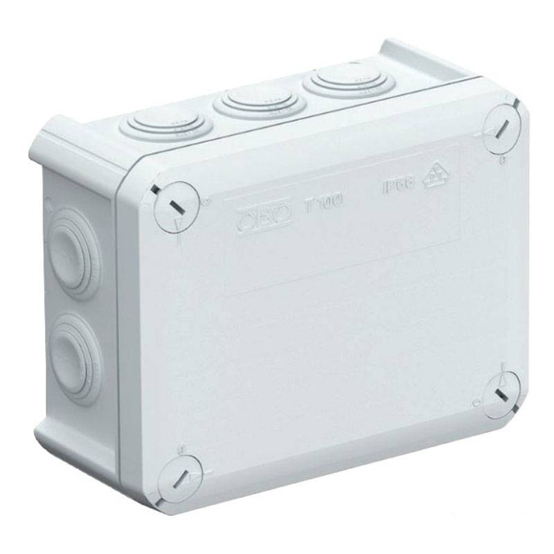 Scatola di derivazione per il collegamento di cavi e linee in ambienti interni ed ambienti esterni protetti. Forma rettangolare senza ingressi. Adatta per il montaggio su pareti e soffitti, il montaggio su lamiere di montaggio e filettatura nel pavimento. Con la possibilità di fissaggio interno e il montaggio su sezioni angolari. Coperchio con chiusura rapida, piombabile. Costruito con materiali privi di alogeni. Scatola di derivazione a norma DIN EN 60670. Antifiamma a norma DIN EN 60695-2-11, temperatura di prova 650 °C. Resistenza all'impatto IK05 a norma DIN EN 50102.