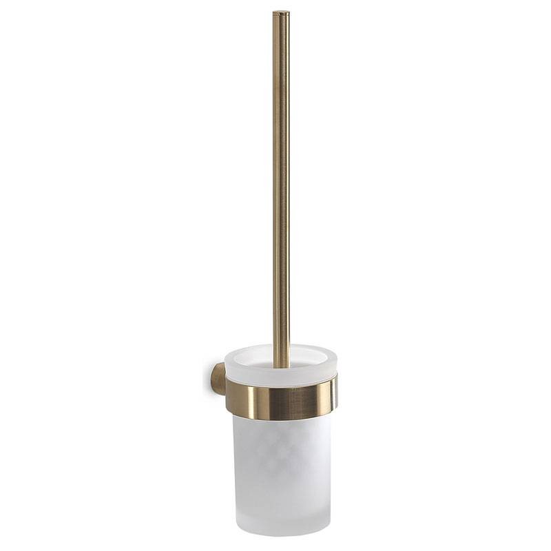 Porta scopino a muro Gedy Pirenei realizzato in acciaio inox e cromall, con contenitore in vetro satinato, colore oro matto, ciuffo in setole, dimensioni 8,4x10,4x37cm.