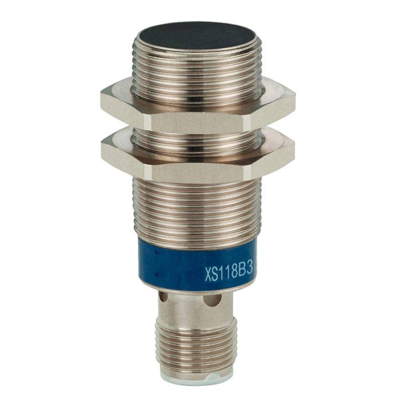 Il sensore induttivo cilindrico XS (filettatura M18) ha un fronte di rilevamento PPS e un involucro in ottone nichelato. Ha una distanza di rilevamento di 8 mm, uscita PNP con funzione NA e un connettore M12. Ha una tensione di alimentazione da 12 a 24 Vcc.