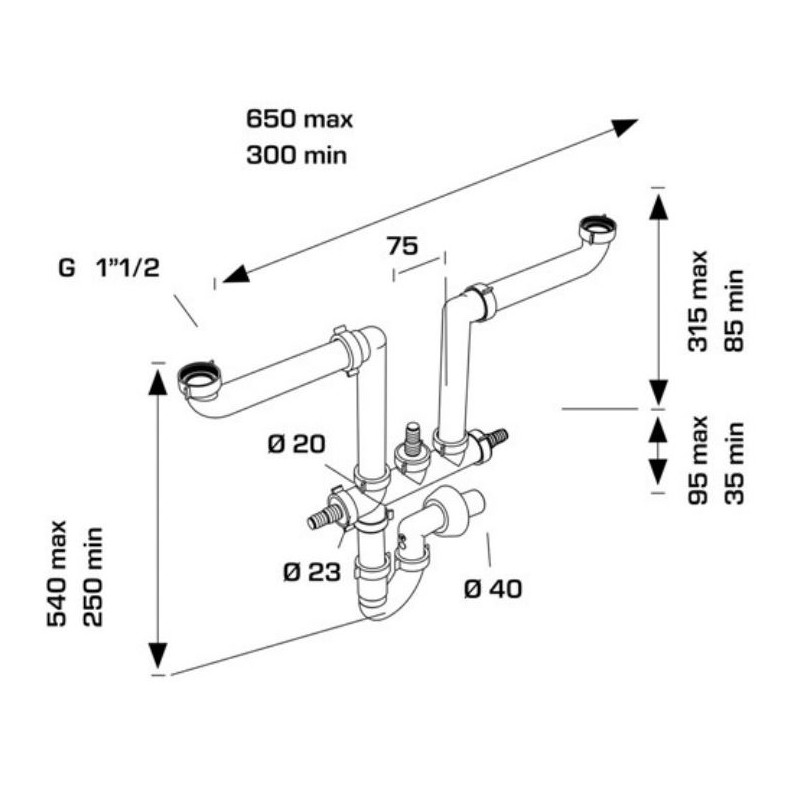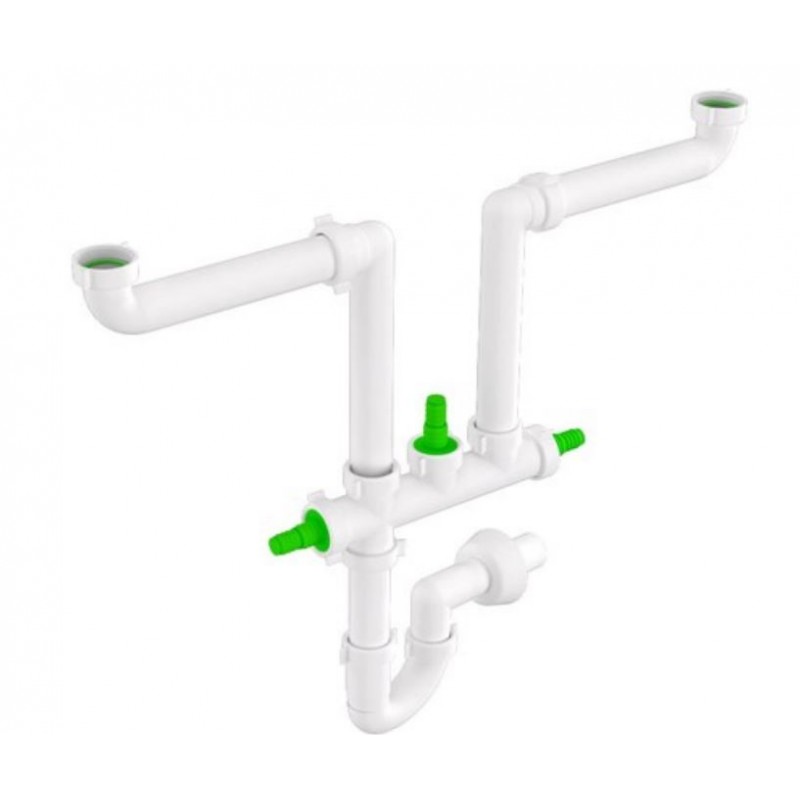 Sifone per lavello cucina Bonomini Space 2, due entrate e tre attacchi ausiliari con le seguenti caratteristiche: