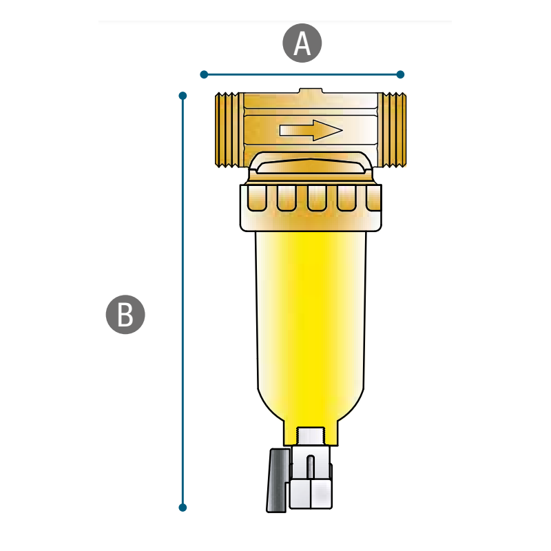 Filtro dissabbiatore pulente con testa e ghiera in Ottone. Cartuccia Inox. Pulente in quanto dotato di rubinetto di scarico che permette di espellere la sabbia senza smontare il filtro. Ovunque sia necessario avere acqua priva di solidi di piccolissime dimensioni e, in particolare, di sabbia e ove vi siano problemi di spazio consente una facile installazione.