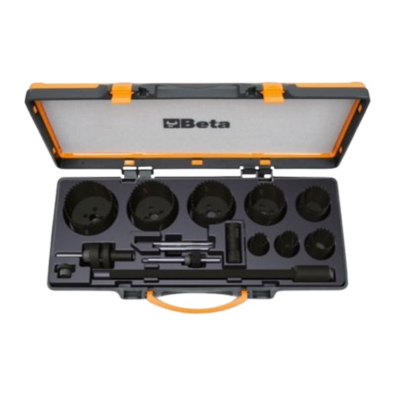 Set di Seghe a Tazza Beta, ideale per elettricisti e installatori. Completo di alberi, punte, prolunga e adattatore, in robusta cassetta metallica, con le seguenti caratteristiche: