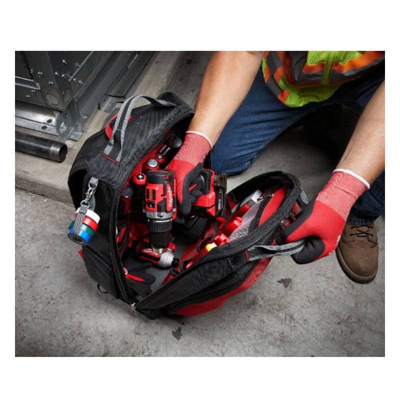 Lo zaino porta utensili Milwaukee Packout è progettato per soddisfare le esigenze dei professionisti del settore elettrico, idraulico e edile. Dotato di ben 48 tasche interne ed esterne, consente una gestione ordinata e accessibile di ogni utensile, dai piccoli accessori agli attrezzi manuali di uso quotidiano.