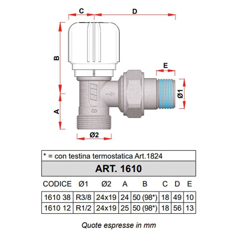 - Valvola cromata a squadra termostatizzabile per radiatori predisposta per il montaggio di dispositivi termostatici o elettrotermici, con attacco per tubo rame, plastica e multistrato, codolo preguarnito, tenuta tra codolo e corpo valvola in HPF, perno intercambiabile in acciaio inox con doppio o-ring di tenuta e volantino in ABS. Temperatura max di esercizio 95°C . Pressione max d'esercizio 10 bar.