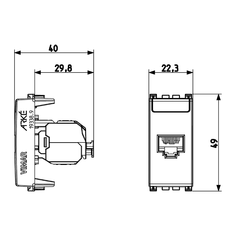 Presa dati Vimar Arke RJ45 con connettore Netsafe Cat. 5e, non schermata, cablaggio universale T568A/B, 8 contatti, morsetti ad incisione d'isolante senza utilizzo di utensile, 1 modulo colore grigio.