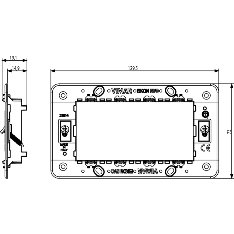 Supporto per qualsiasi scatola 4 moduli (frutti) anche non di marca Vimar. Questo supporto permette di agganciare solo le placche Vimar Eikon.